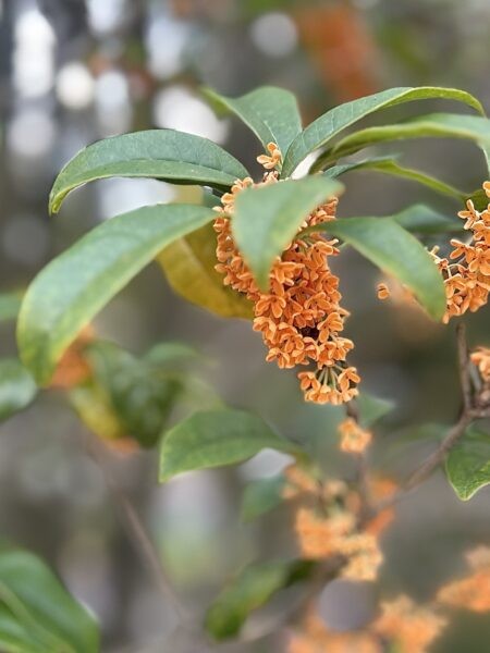 秋らしい香りを街中に放っているこの木の花、数枚の葉の下にたくさんの花を付けるという面白い咲き方をしています。